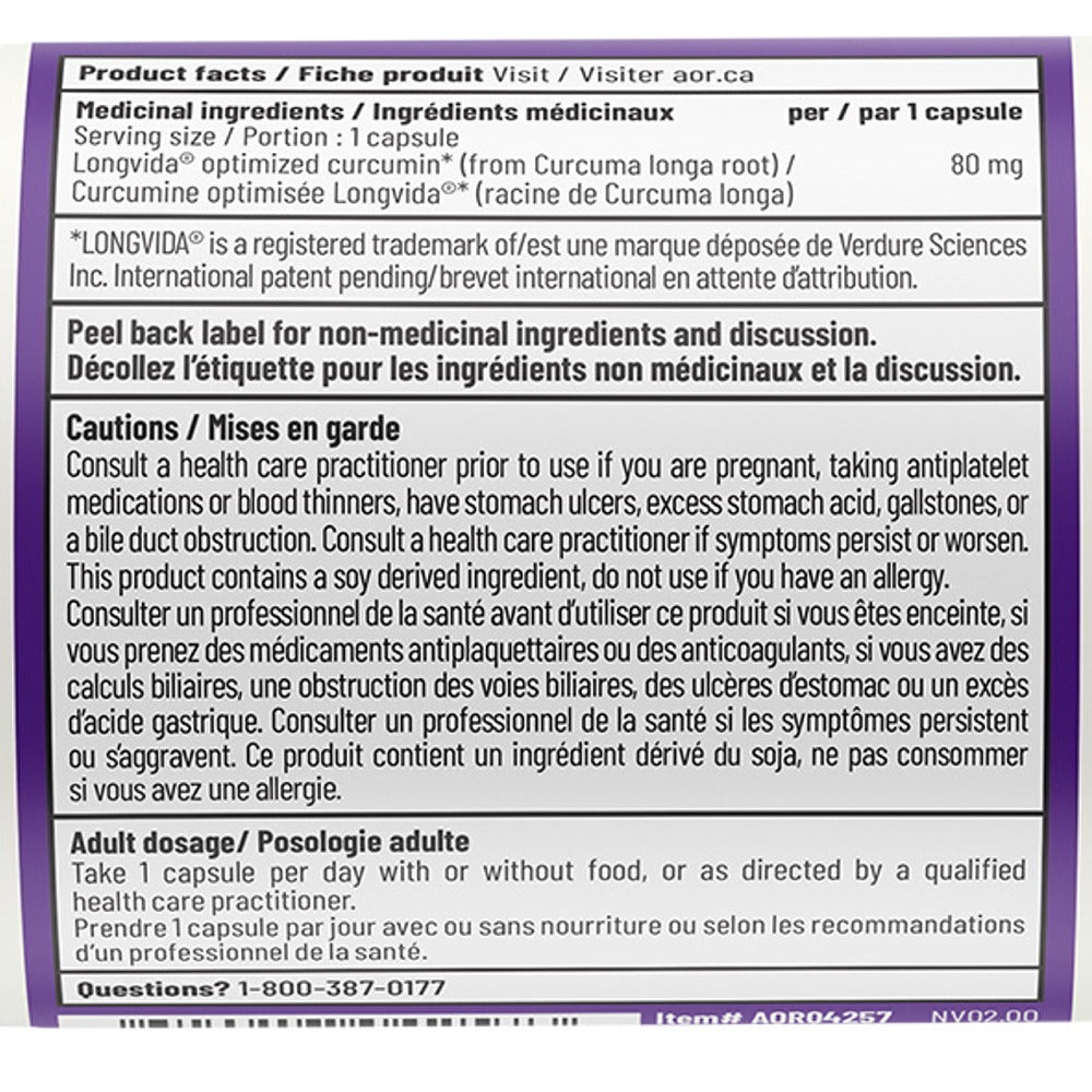 AOR - CurcuVIVA - 60 Capsule(s) - NPN: 80034713 -- CurcuVIVA provides an 80 mg maintenance dose of Longvida Optimized Curcumin for those with osteoarthritis, joint pain, chronic pain and more. Longvida Curcumin was specially formulated to provide a solution to the curcumin conundrum of low bioavailability, poor absorption and rapid breakdown. Although bioavailability and absorption help determine effectiveness, the key lies within its ability to remain free. This free state of curcumin is achieved due to the formulas ability to avoid being rapidly broken down within the body. Because free curcumin retains its unbroken form, it is then taken up through the lymph system into the bloodstream where it is stable, concentrated, and retains maximum effectiveness for up to 24 hours.Curcumin not only provides relief from joint pain and arthritis, but has many other benefits. It supports digestion, liver and gallbladder health, carries antibacterial, antifungal and antiviral effects, and even promotes healthy cholesterol levels and cardiovascular health.AOR AdvantageAORs CurcuVIVA advanced technology allows it to be absorbed very rapidly by the body, meaning that it is an excellent choice for rapid pain relief. Furthermore, with an effective dose of just one capsule per day CurcuVIVA is convenient and economical.