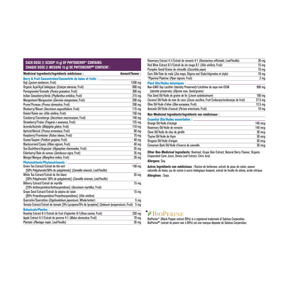 PROGRESSIVE - PhytoBerry - 900 Gram(s) - NPN: 80036256 -- PhytoBerry is a highly concentrated berry based whole food supplement that is loaded with natural antioxidants. Featuring over 40 high ORAC value fruit concentrates, phytonutrients, essential fatty acids and herbal extracts, PhytoBerry is specifically designed to offer whole body antioxidant® protection. A single serving has the equivalent nutrient content of 6 to 8 servings of fresh fruit. Highly concentrated whole food supplement Over 40 ORAC rich food concentrates, phytonutrients and essential fatty acids ORAC score of ~5000 units Nutrient equivalent of 6 8 servings of fresh fruit Outstanding source of botanical nutrients Professionally formulated and energetically balanced