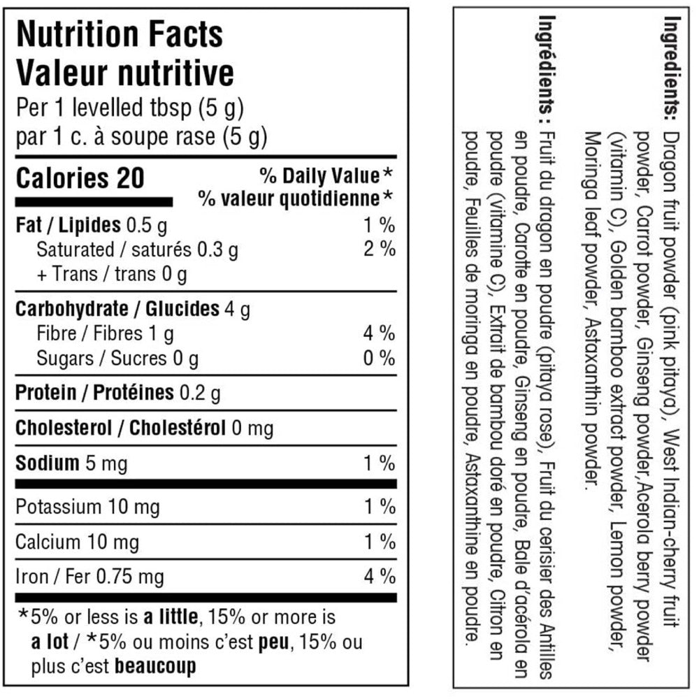 INGREDIENTSDragon fruit powder (Pink pitaya), West Indian-cherry fruit powder, Carrot powder, Ginseng powder, Acerola berry powder (Vitamin C), Golden bamboo extract powder, Lemon powder, Moringa leaf powder, Astaxanthin powderAMINO ACID PROFILE:Carrot and ginseng peptides are sources of the amino acids alanine, arginine, aspartic acid, cysteine (carrot), cysteine (carrot), glutamic acid, glycine, histidine, hydroxyproline, isoleucine, leucine, lysine, methionine, phenylalanine, proline, serine, threonine, tryptophan (carrot), tyrosine (ginseng), and valine.