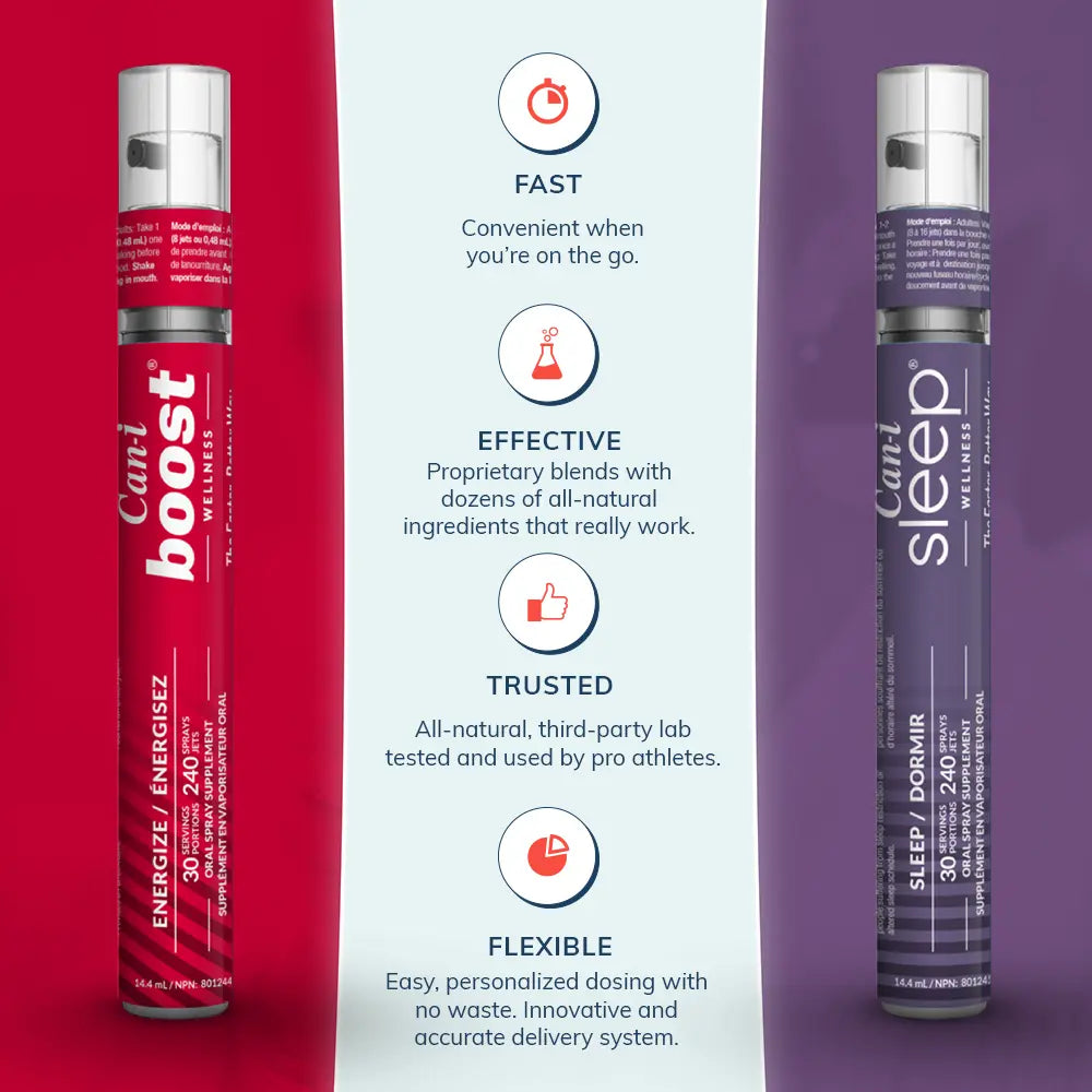 Cross that “hard-to-buy-for-person” off your holiday shopping list. This all-natural, cost-effective combo of Can-i Boost and Can-i Sleep combines vitamins for energy with the best natural sleep aid. Sleep soundly at night and get an extra boost of energy and focus when you wake up. Give the gift of sleep and energy this holiday season.